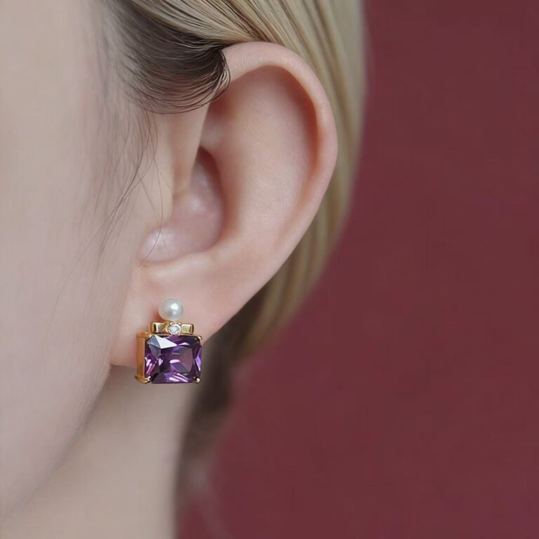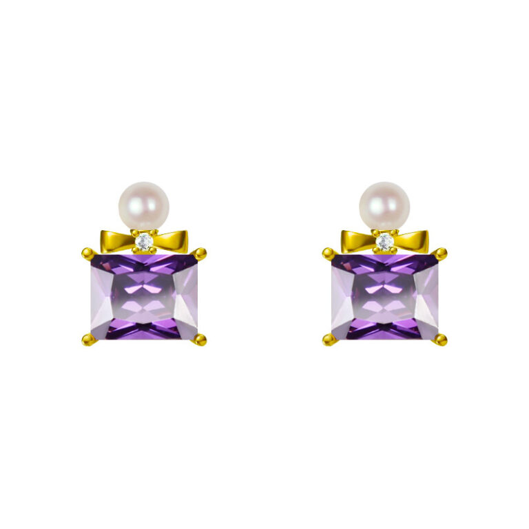 Luxury Elegant Square Crystal, Pearl & Bowknot Stud Earrings For Evening & Daily Wear, Vintage Perfume Bottle Design, 18K Gold Amethyst, Zircon & Pearl Earrings