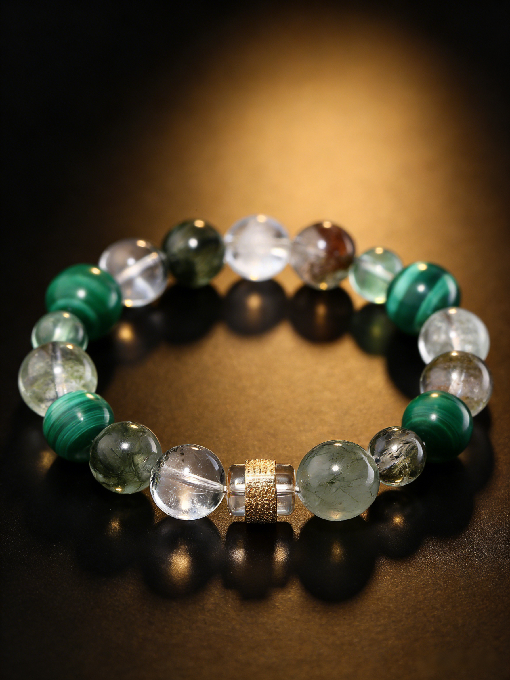 Inspired by the ancient Eastern Guanyin culture, this bracelet combines the energy of natural green phantom, rutilated quartz, white crystal and malachite. In Western spiritual culture, green crystals symbolize growth and abundance, white crystal represents purification and clarity, and malachite is regarded as a protective stone. Guanyin, as a symbol of compassion and harmony, embodies the Western pursuit of family well-being and inner peace. This design integrates Eastern mystical energy with Western spiritual needs, creating a talisman that brings family harmony and wealth attraction.