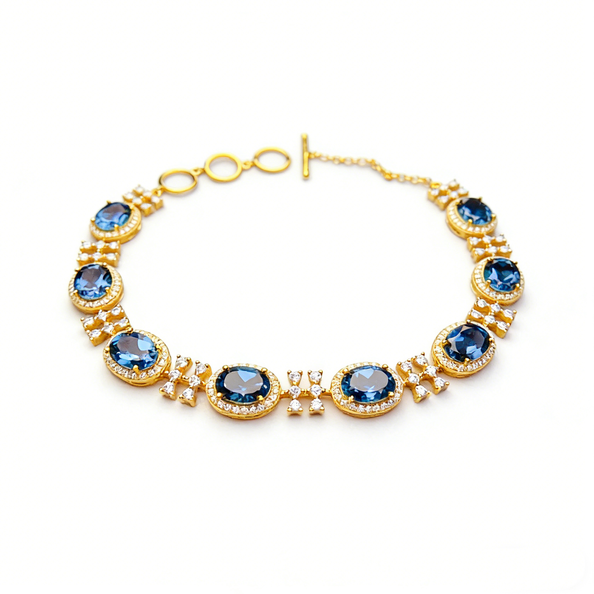 This bracelet features natural London blue topaz as the main gemstone, each carefully selected for its vivid color and brilliant clarity. The bracelet is crafted from high-quality S925 silver with a gold-plated finish, ensuring both durability and a luxurious, warm luster. The oval-cut topaz stones are securely set in intricate silver settings, accented with small sparkling stones that enhance the overall brilliance. The bracelet has a comfortable fit, designed to gracefully wrap around the wrist, with an adjustable clasp for a perfect fit for different wrist sizes.