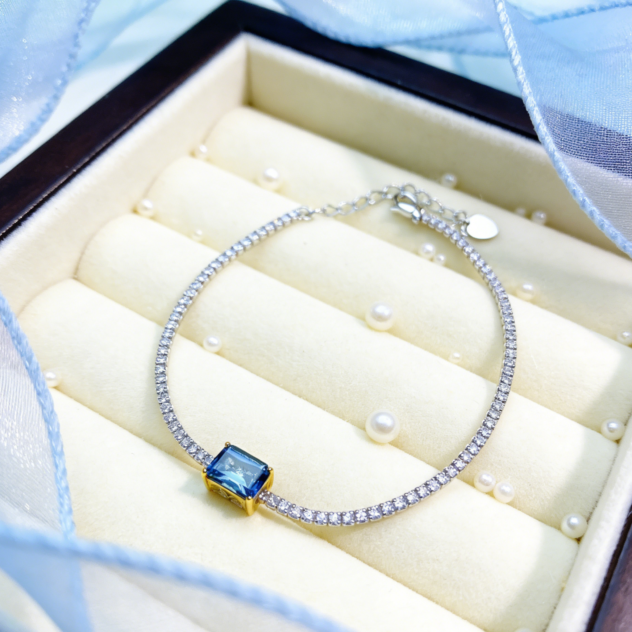 This bracelet is made of high-quality S925 silver, with a square-cut natural topaz as the main stone. The inlaid craft ensures that the topaz is firmly fixed on the bracelet, and the silver chain is paved with small zircon stones, which makes the bracelet more shiny. The length of the bracelet is adjustable, suitable for most wrist sizes. The natural topaz has a unique blue luster, which is clear and transparent, and it is a natural gemstone with high purity.