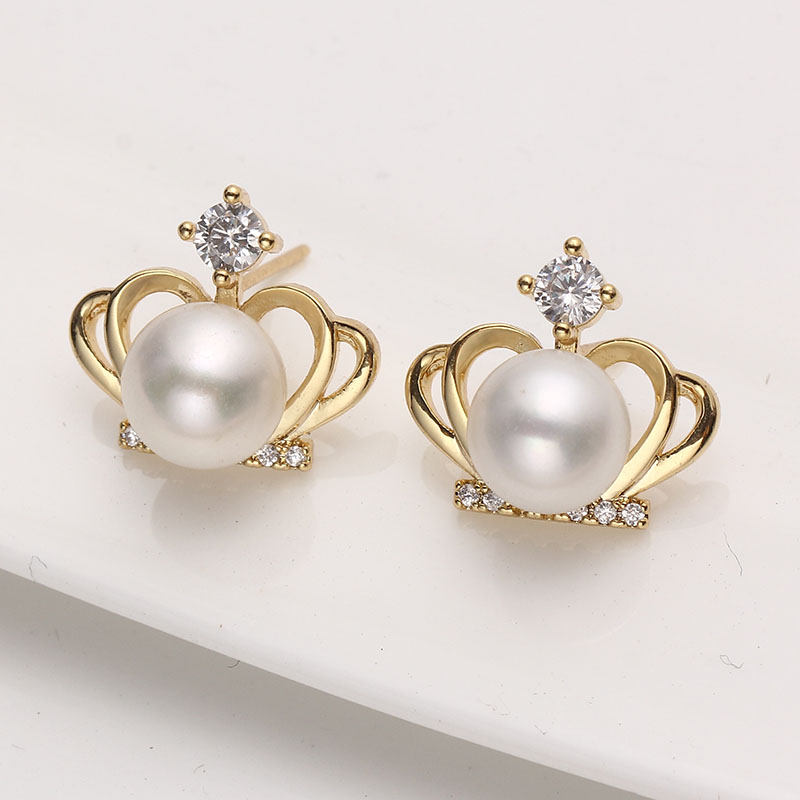 Copper-plated 18K gold crown zirconia pearl earrings with S925 silver posts and open backs