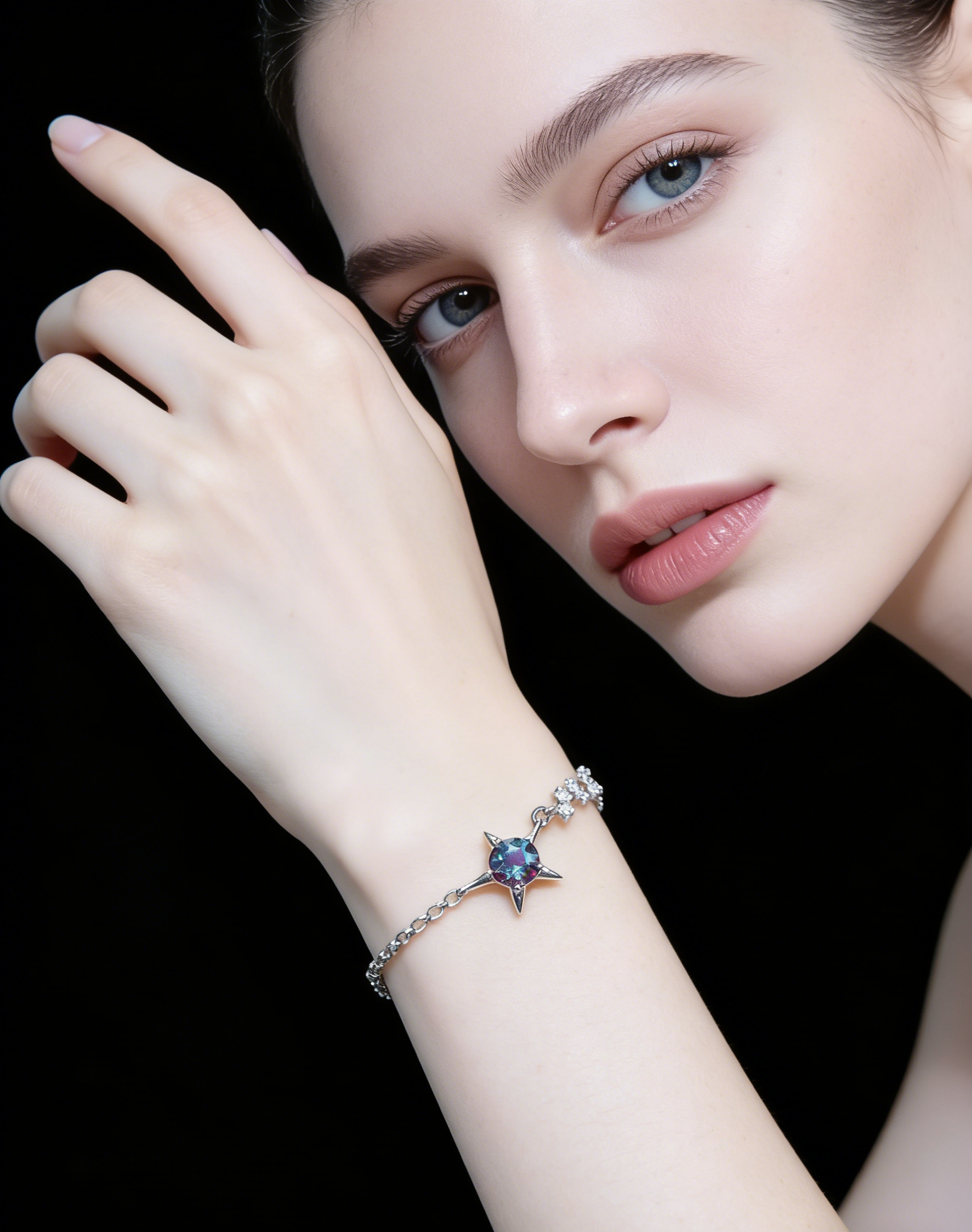 Alexandrite, first discovered in Russia’s Ural Mountains in 1834 on Tsar Alexander II’s birthday, has long been revered in Western culture as a gem of transformation and balance. Its mesmerizing color-shifting effect—from greenish-blue in daylight to purplish-red under warm light—symbolizes the beauty of embracing life’s changes, a value deeply cherished in Western spiritual and personal growth beliefs. The starburst design of this bracelet draws from Western celestial symbolism, where stars represent guidance, hope, and the pursuit of dreams. This piece weaves these two meaningful elements together: the starburst acts as a “guiding light” through life’s transitions, while the alexandrite’s color change reminds the wearer to find grace in every shift, aligning with the Western belief in self-evolution and spiritual harmony.