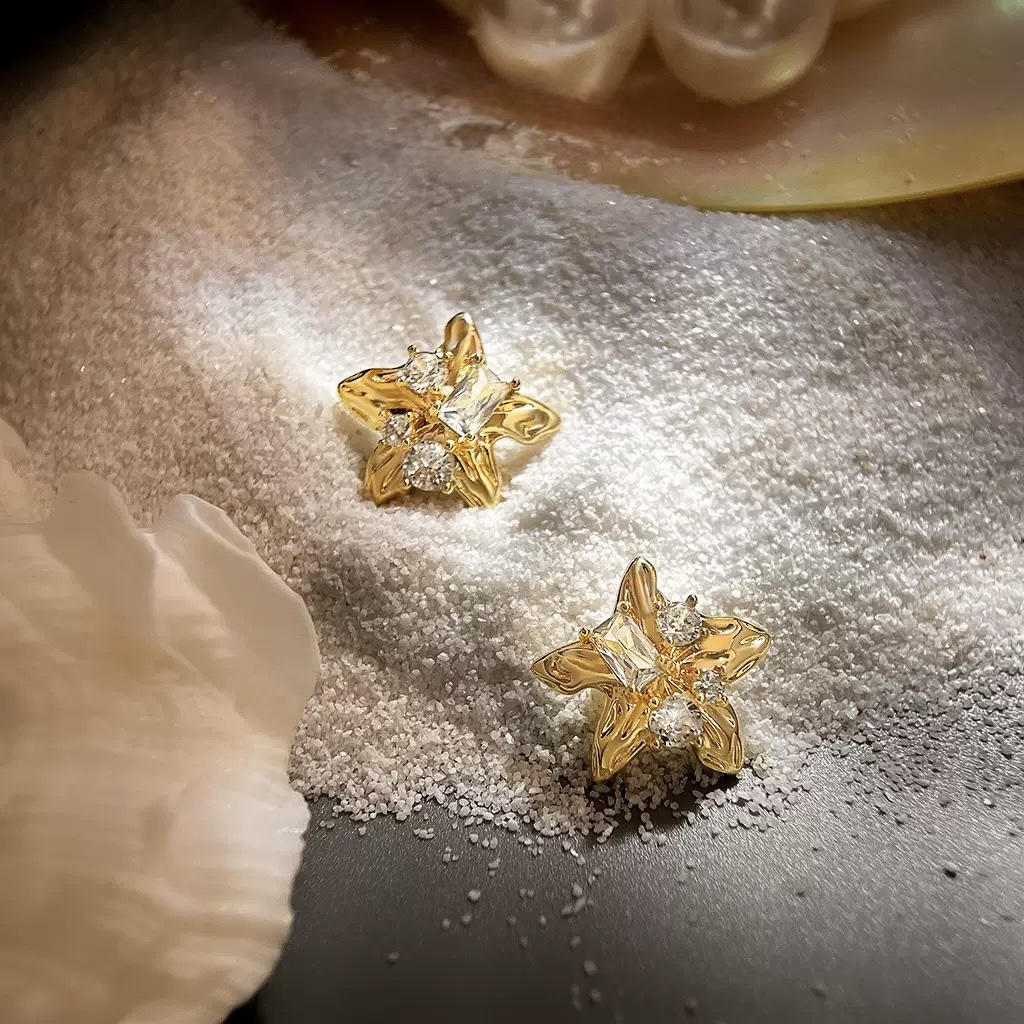 Designer-made earrings featuring 18K gold-plated starfish and zirconia, set in 925 silver. A stylish and luxurious piece with a marine-inspired design perfect for women.
