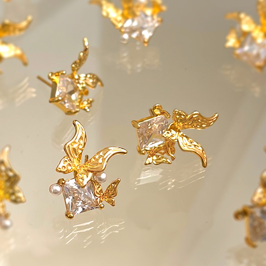 Designer model! Fashionable and high-end plated 18K real gold color retention inlaid zircon butterfly earrings 925 silver needle stud earrings