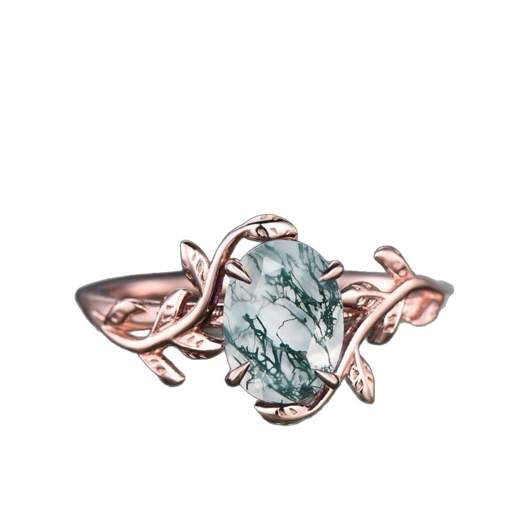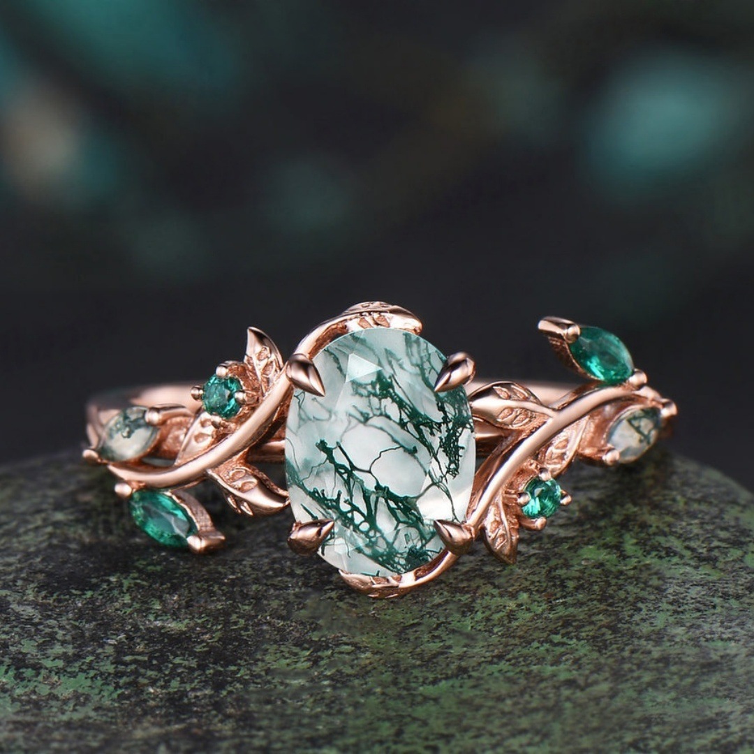 This ring features a 2CT oval-cut natural moss agate as the centerpiece, with delicate emerald accents set in a rose gold-plated sterling silver band. The moss agate has a Mohs hardness rating of 6.5-7, making it durable for everyday wear with proper care. The vine-shaped band is intricately carved with vintage details, creating a unique and eye-catching design that combines the beauty of nature with elegant craftsmanship. Each moss agate stone is one-of-a-kind, with its own unique pattern of green inclusions, ensuring that every ring is a unique piece of jewelry.