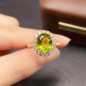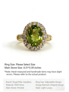 This ring features a natural oval peridot ( 0.32*0.39 inch) as the centerpiece, set in high-quality 925 silver with an intricate silver-inlaid craft and a gold plated finish. The peridot boasts a vivid olive green hue, with a brilliant cut that enhances its natural luster, showing the crystal-clear texture of the gemstone. The surrounding small diamonds are carefully inlaid to create a luxurious and elegant look, complementing the fresh green of the peridot. The 925 silver band is polished to a smooth finish, ensuring comfortable wear for long periods. Each ring is carefully crafted to highlight the natural beauty of the peridot, making it a unique and exquisite piece of jewelry.