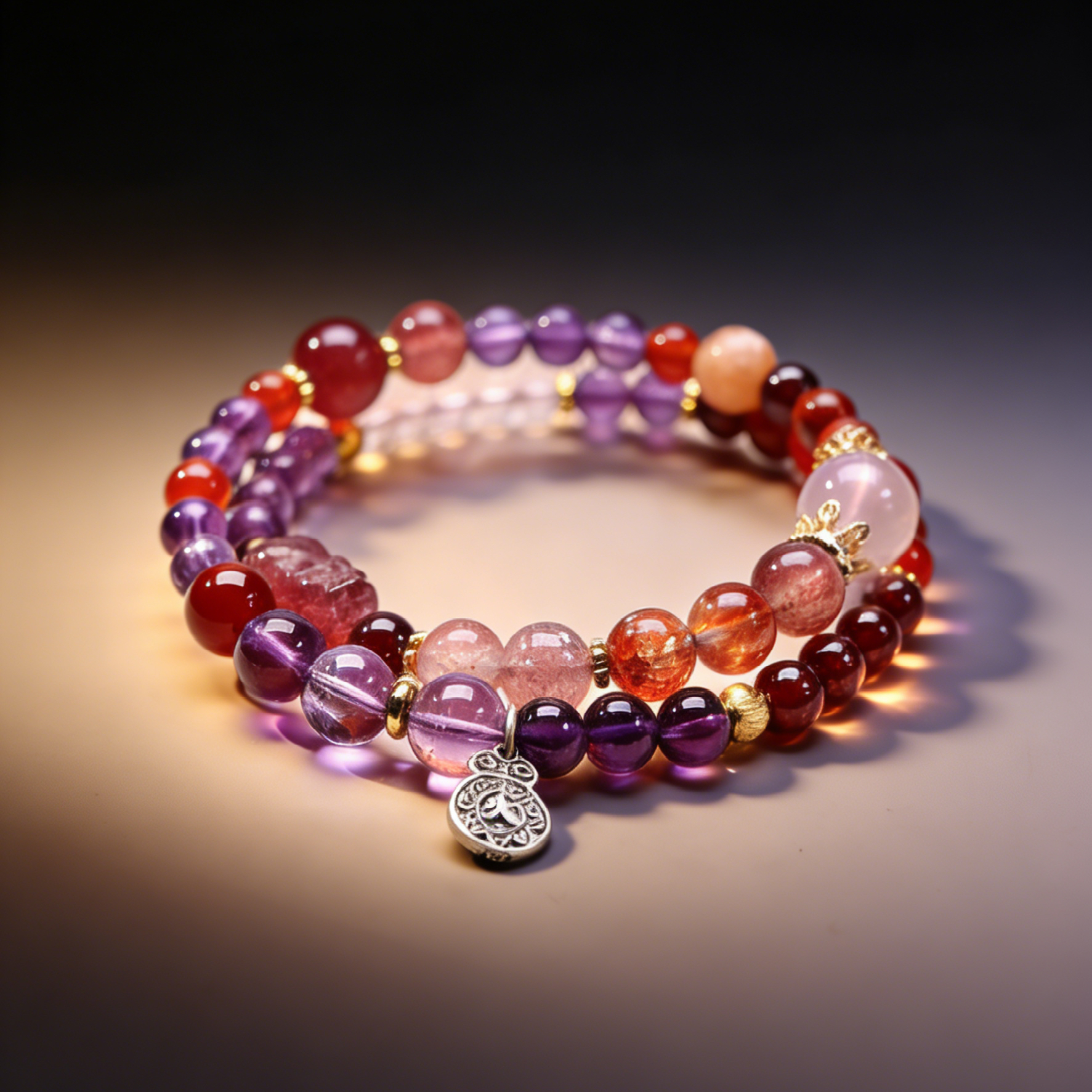 This bracelet is inspired by the Bohemian nomadic culture, which has long revered fire as a symbol of warmth, courage, and the power to dispel darkness. In Western spiritual beliefs, fire energy corresponds to the activation of the solar plexus chakra, which is closely related to personal confidence, motivation, and action. Combining the Eastern Five Elements theory of balancing fire energy with Western chakra healing, this bracelet uses natural crystals to create a harmonious energy field. The strawberry quartz, as the main stone, brings gentle love energy, while the amethyst calms the mind and balances the restlessness of fire energy, and the red agate and sunstone enhance the fire energy to help the wearer activate their inner power, achieve physical and mental balance, and embrace a free and authentic self.