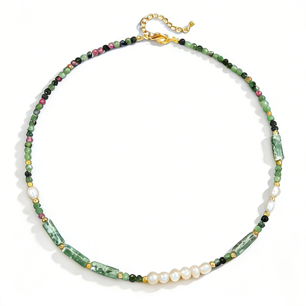 Inspired by the 2026 jewelry trend of “natural resilience” and the warm, earthy Maillard aesthetic, this set draws from ancient Western beliefs that natural stones carry the energy of the earth. Green spot stone, revered in Western crystal traditions for its ability to bring calm and resilience, pairs with freshwater pearls— a symbol of purity and family heritage in European royal history. The design echoes the understated luxury of “old money” style, blending the organic, textured green spot stones with the luminous softness of freshwater pearls to create a piece that balances cozy autumnal warmth with serene, uplifting energy, perfect for those seeking emotional connection and timeless elegance in their jewelry.