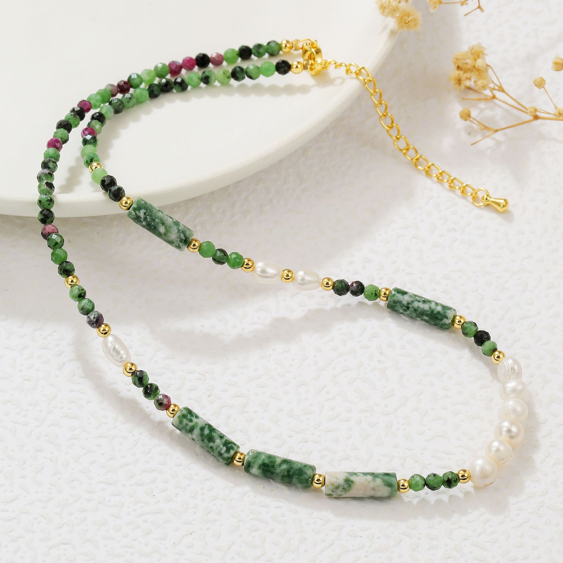Freshwater Pearl & Natural Stone Beaded Necklace & Bracelet, Maillard Style Green Spot Stone Sweater Chain – Daily & Party Wear, Autumn/Winter Outfit, Green-White-Gold Color Scheme
