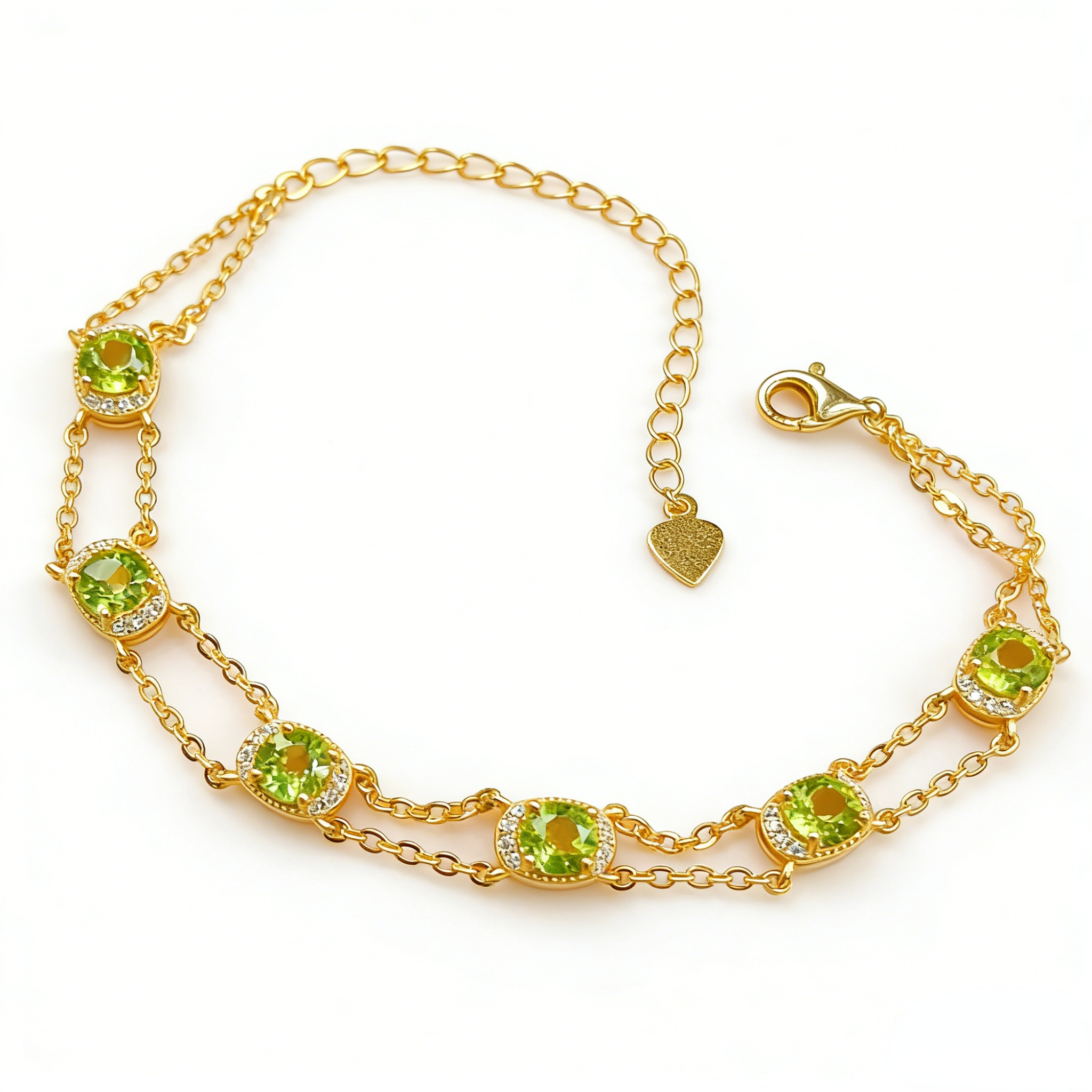Summer Lime Natural Peridot Bracelet, Double Chain 925 Sterling Silver Gold Plated Gemstone Bracelet, August Birthstone Dainty Jewelry for Women