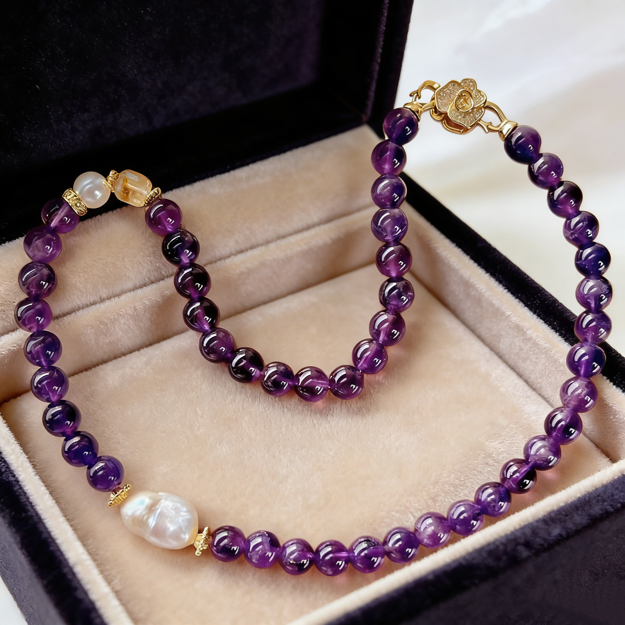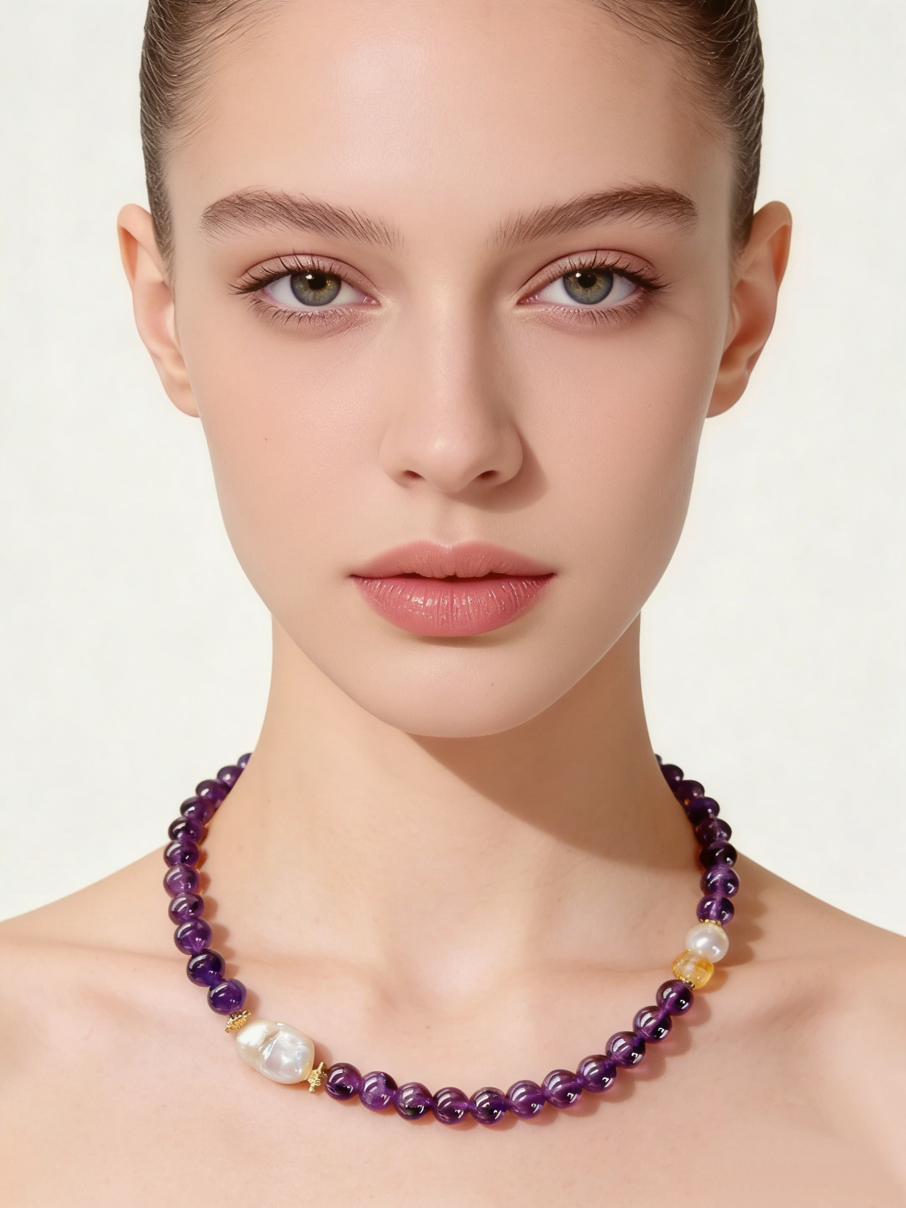 This handcrafted choker necklace features premium natural amethyst beads, with their rich, deep purple hue and natural crystal inclusions that make each piece one-of-a-kind. We’ve paired them with a lustrous natural baroque pearl, whose irregular, organic shape adds a touch of vintage romance, a warm citrine accent bead, and delicate gold-plated details. The exquisite flower-shaped clasp, encrusted with tiny sparkling stones, adds a subtle luxurious touch, echoing the retro aesthetic of old-world jewelry.