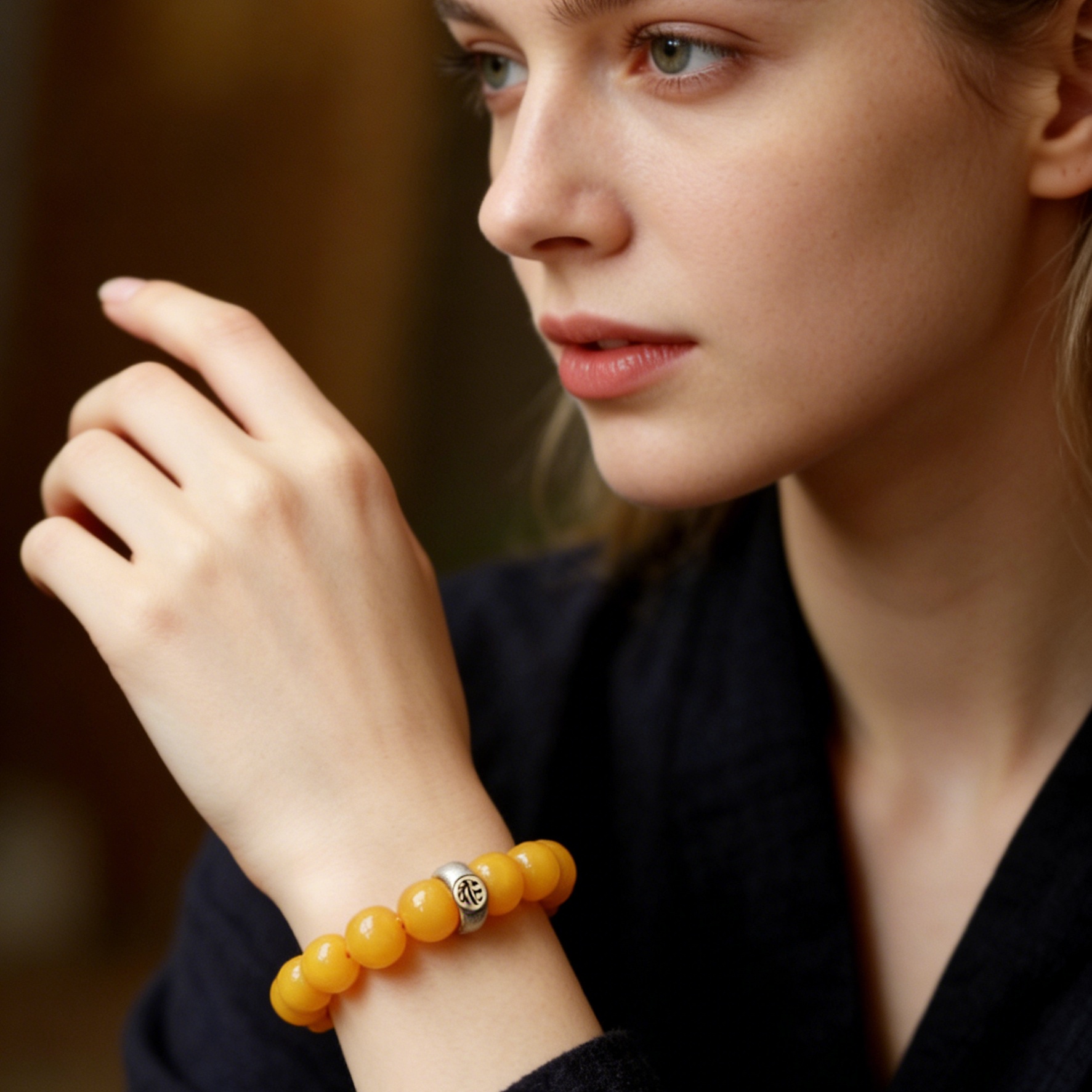 In Norse mythology, amber is known as “Gold of the North”, a treasure forged by the ancient forests’ resin through millions of years of earth’s transformation, carrying the warm energy of prehistoric sunlight. We designed this bracelet to honor this timeless legacy: the rich, vibrant chicken fat yellow hue of the old amber aligns with Western aesthetics that favor bold, luminous colors, symbolizing vitality, good fortune and the radiance of nobility. The S925 silver accent with an intricate symbol adds a touch of vintage spiritual charm, while the subtle red gemstone accent creates a striking visual balance, echoing the Western love for layered, natural-inspired designs. This piece is not just jewelry, but a wearable connection to the earth’s ancient wisdom, believed to bring calm, positive energy and protection to the wearer.