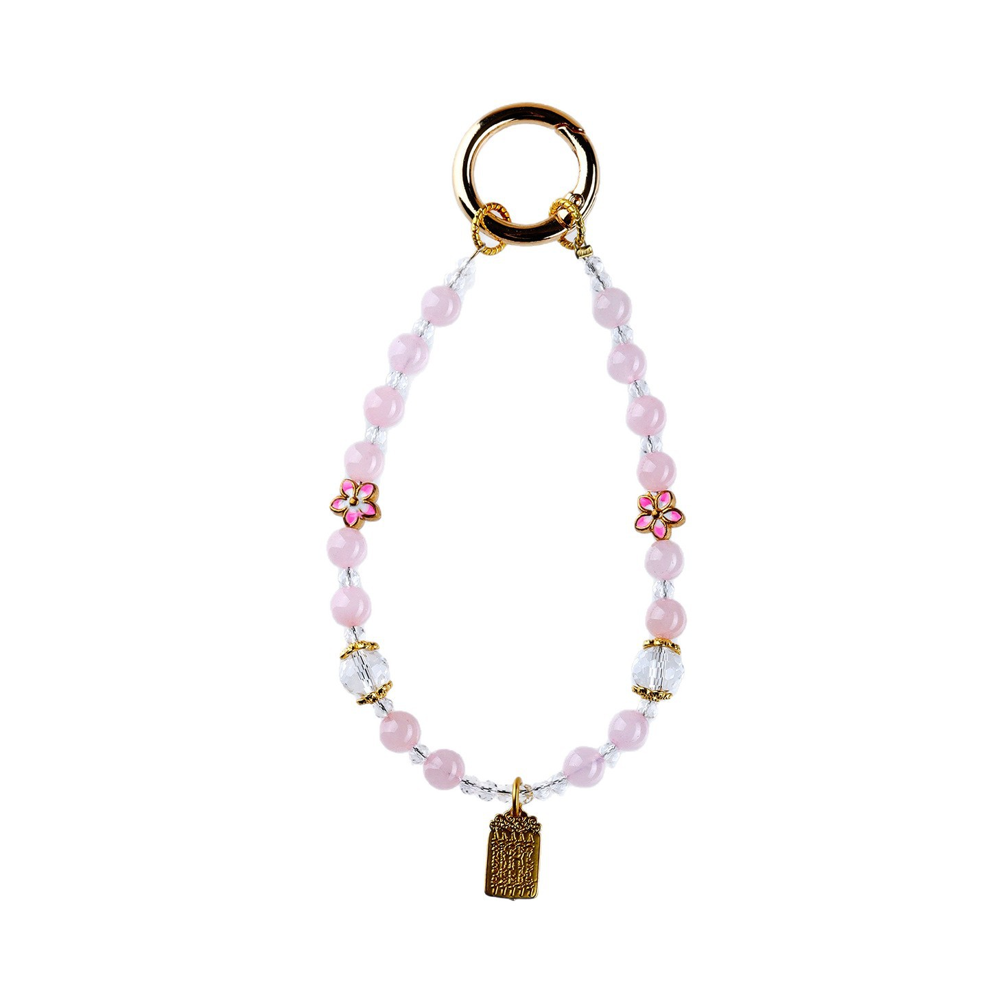 This keychain is handcrafted with natural rose quartz beads, each carefully selected for their soft pink hue and smooth texture. The peach blossom accents are made with enamel-inlaid metal, adding a vibrant and delicate touch. The key ring is gold-plated, ensuring durability and a luxurious shine. The crystal beads are strung together with strong, flexible cord, making the keychain both sturdy and lightweight. It features a small engraved gold tag, adding a subtle personalized detail. Each piece is unique due to the natural variations in the rose quartz beads.