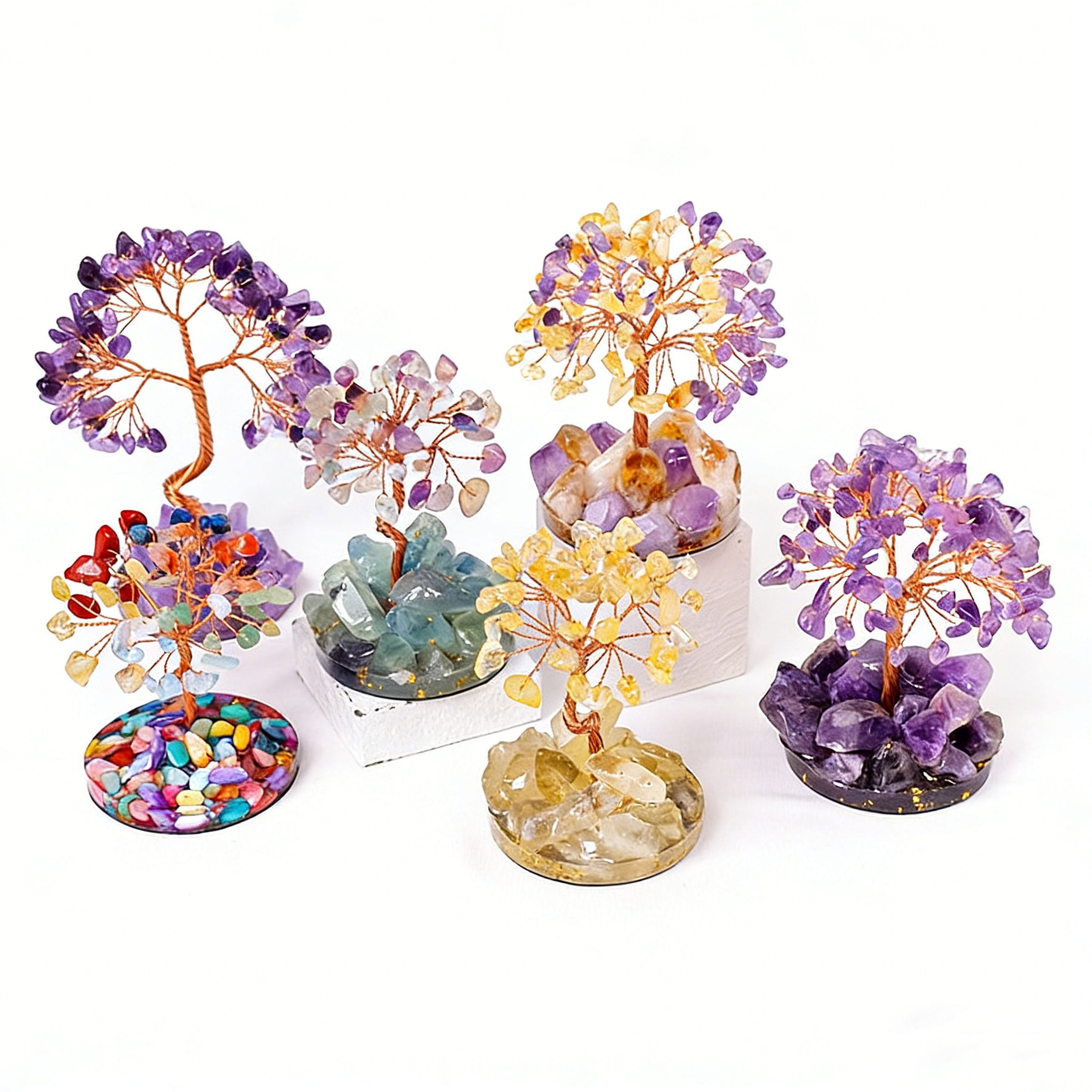 • Amethyst & Citrine Tree: Combines the calming energy of amethyst and the sunny energy of citrine, balancing your spirituality and material life.