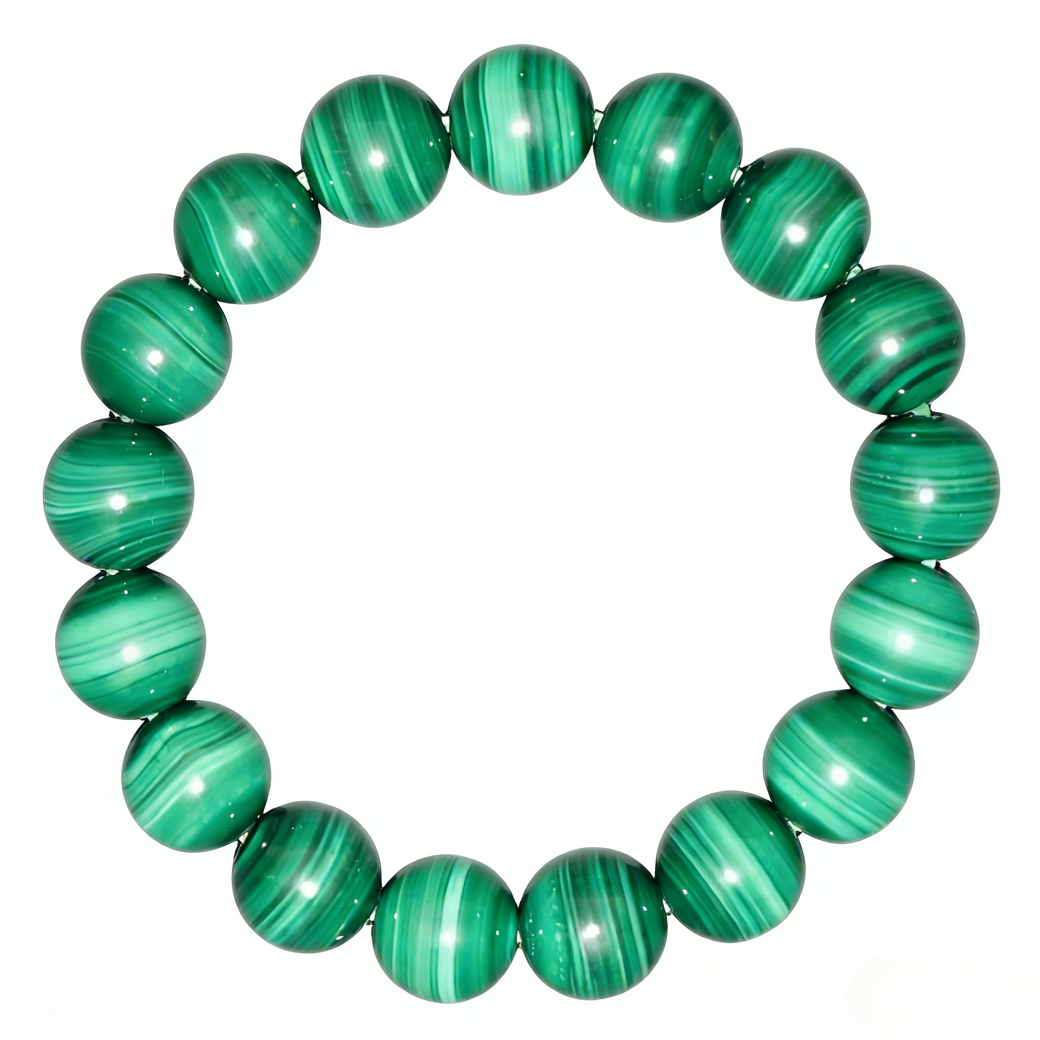 This bracelet is meticulously crafted with natural malachite beads, each featuring the iconic layered green stripes that are unique to malachite. The beads are paired with crystal to enhance the stone’s inherent energy, creating a powerful field of protection and prosperity. Every bead is carefully polished to a smooth, glossy finish, ensuring comfortable wear on the wrist.  The natural variations in the malachite patterns mean that each bracelet is one-of-a-kind, with no two pieces exactly the same.