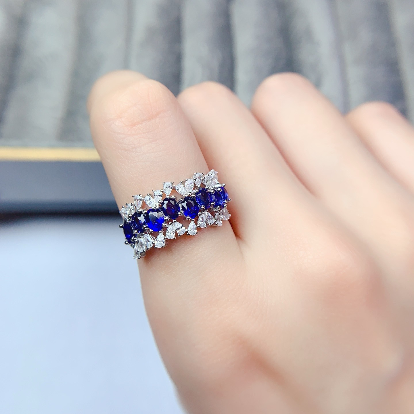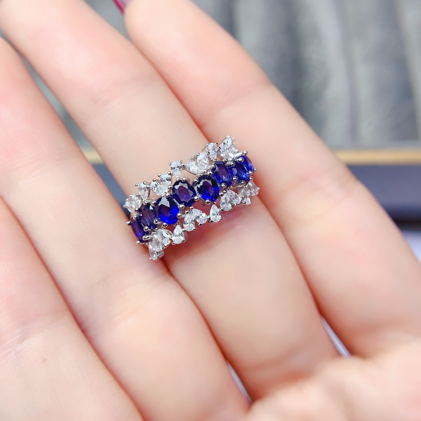Product Introduction This ring features natural clustered sapphires ( 0.12*0.16 inch) as the centerpiece, set in 925 silver with zircon-embellished silver-inlaid craft. The sapphires have a vivid royal blue hue, with brilliant cut that enhances their natural luster. The 925 silver band is polished for comfortable wear.