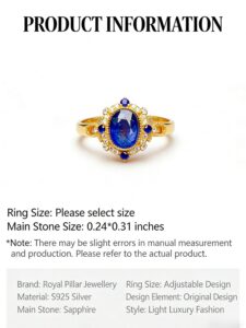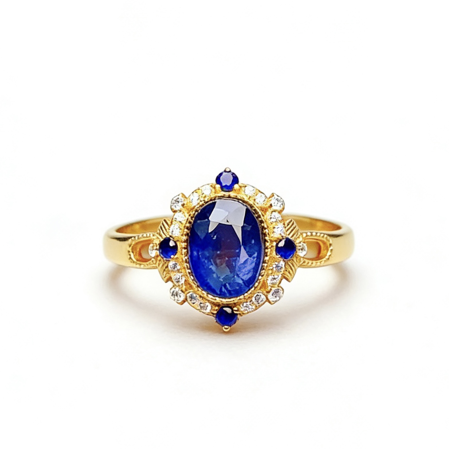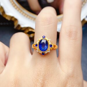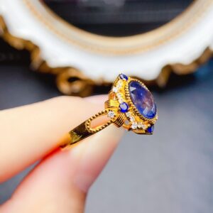 This ring features a natural oval sapphire ( 0.32*0.39 inches) as the centerpiece, set in high-quality 925 silver with an intricate silver-inlaid craft and a gold plated finish. The sapphire boasts a vivid royal blue hue, with a brilliant cut that enhances its natural luster, showing the crystal-clear texture of the gemstone. The surrounding small sapphires and diamonds are carefully inlaid to create a luxurious and elegant look, complementing the deep blue of the sapphire. The 925 silver band is polished to a smooth finish, ensuring comfortable wear for long periods. Each ring is carefully crafted to highlight the natural beauty of the sapphire, making it a unique and exquisite piece of jewelry.