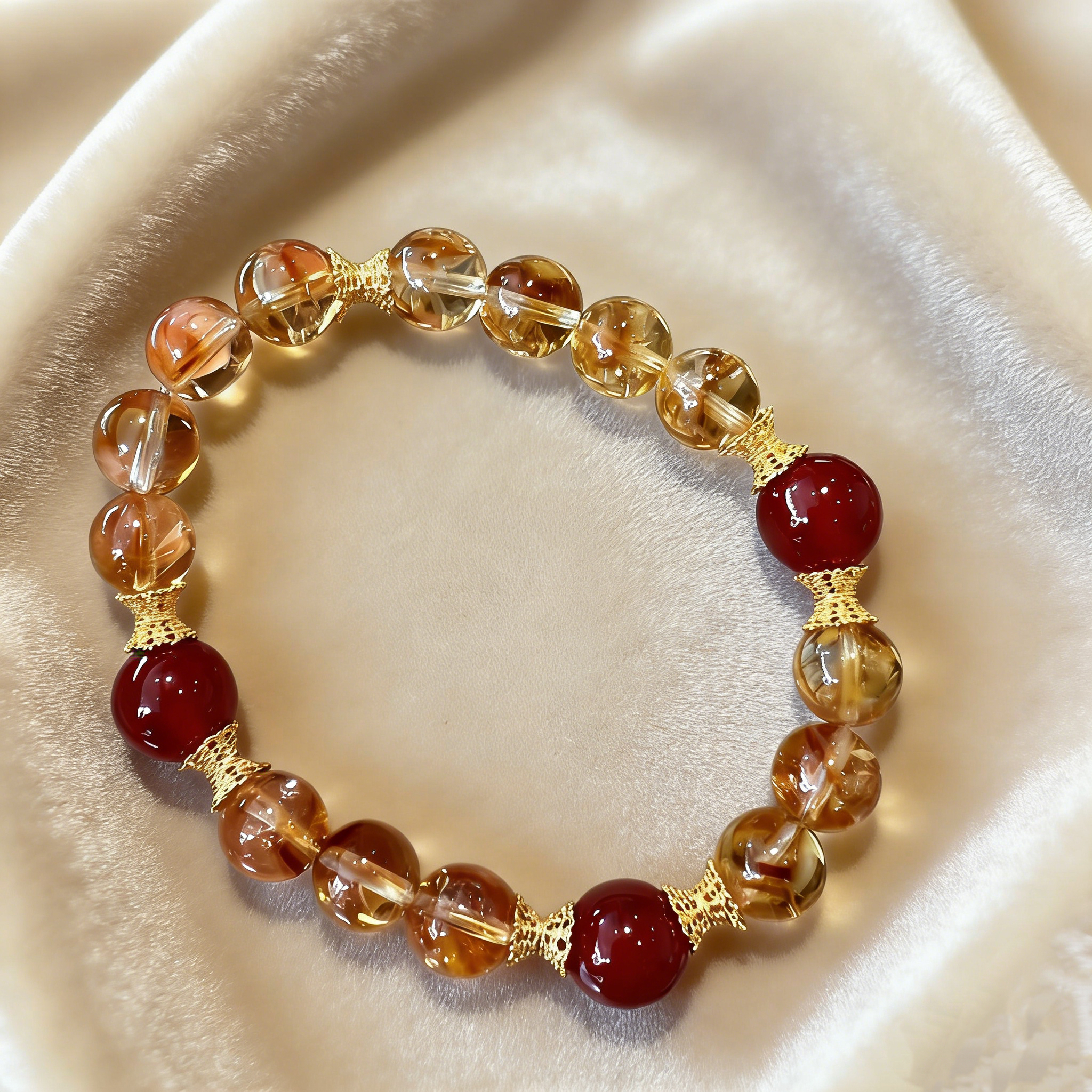 This handcrafted beaded bracelet features natural high-quality citrine as the main stone, paired with premium red agate accent beads, with delicate alloy spacer beads to add a touch of elegant shine. The stretchy cord design ensures a comfortable fit for most wrist sizes, easy to put on and take off for daily wear.