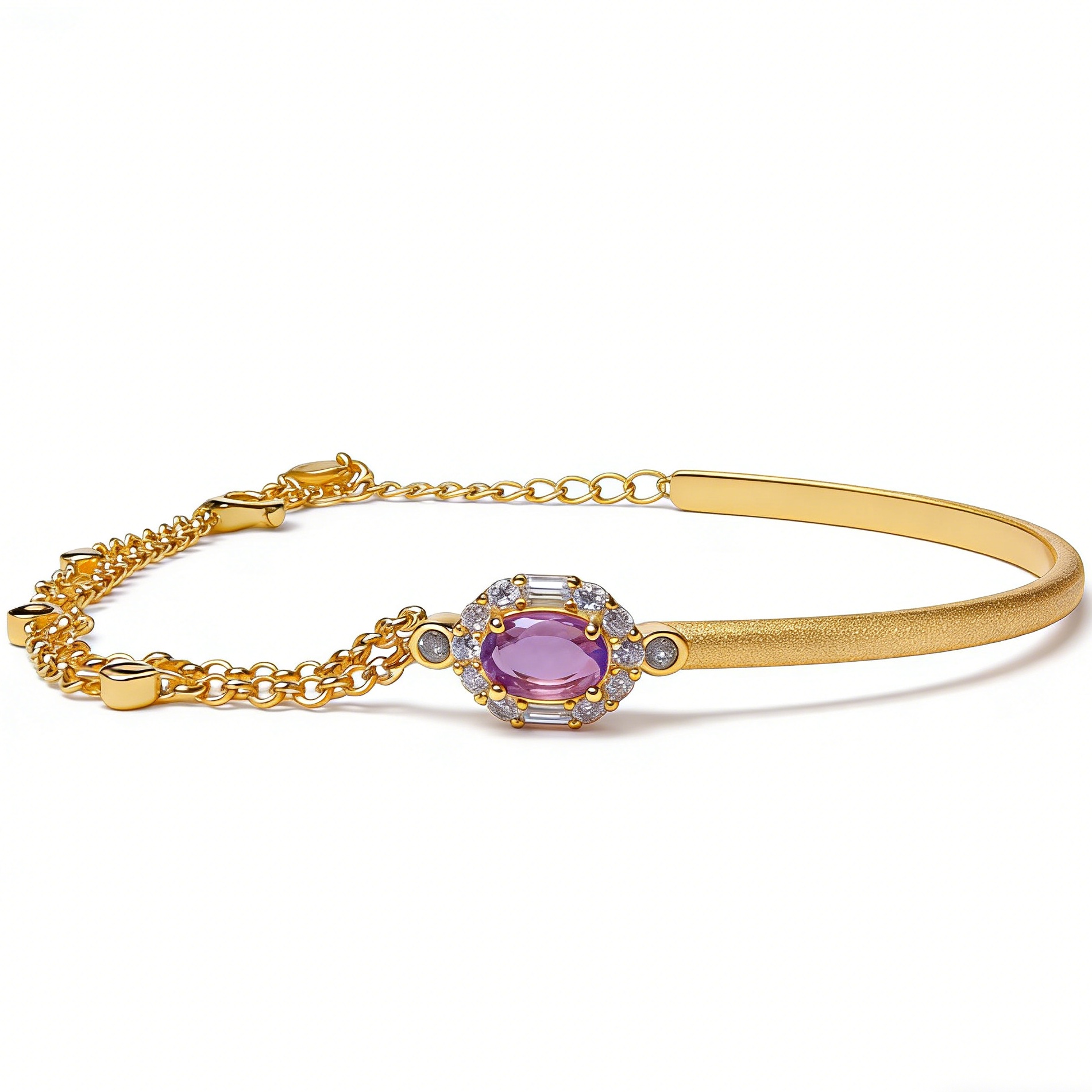 This bracelet features a natural oval fluorite as the centerpiece, set in high-quality S925 silver with a gold-plated finish for a warm, luxurious luster. The double-layer chain design combines a sleek bangle and a delicate chain, adding dimension and movement to the piece. The surrounding small zircon accents enhance the brilliance of the fluorite, showcasing exquisite craftsmanship and attention to detail.