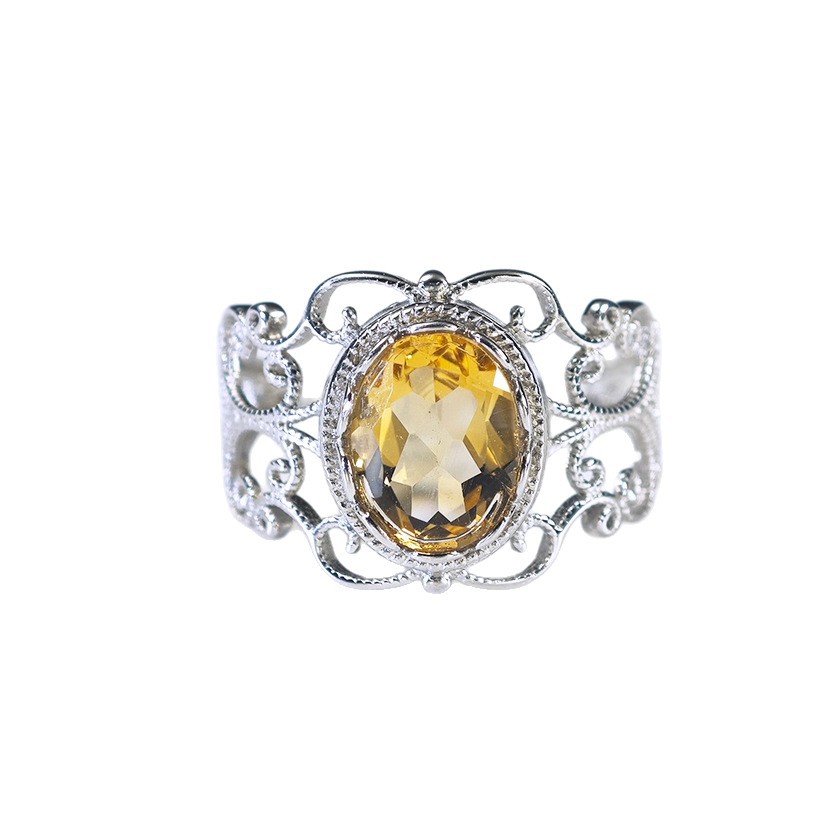 This statement ring features a stunning oval-cut natural citrine as its centerpiece. The gemstone boasts a warm, sun-kissed golden hue, with brilliant faceting that catches the light with every movement, casting a soft, radiant glow.