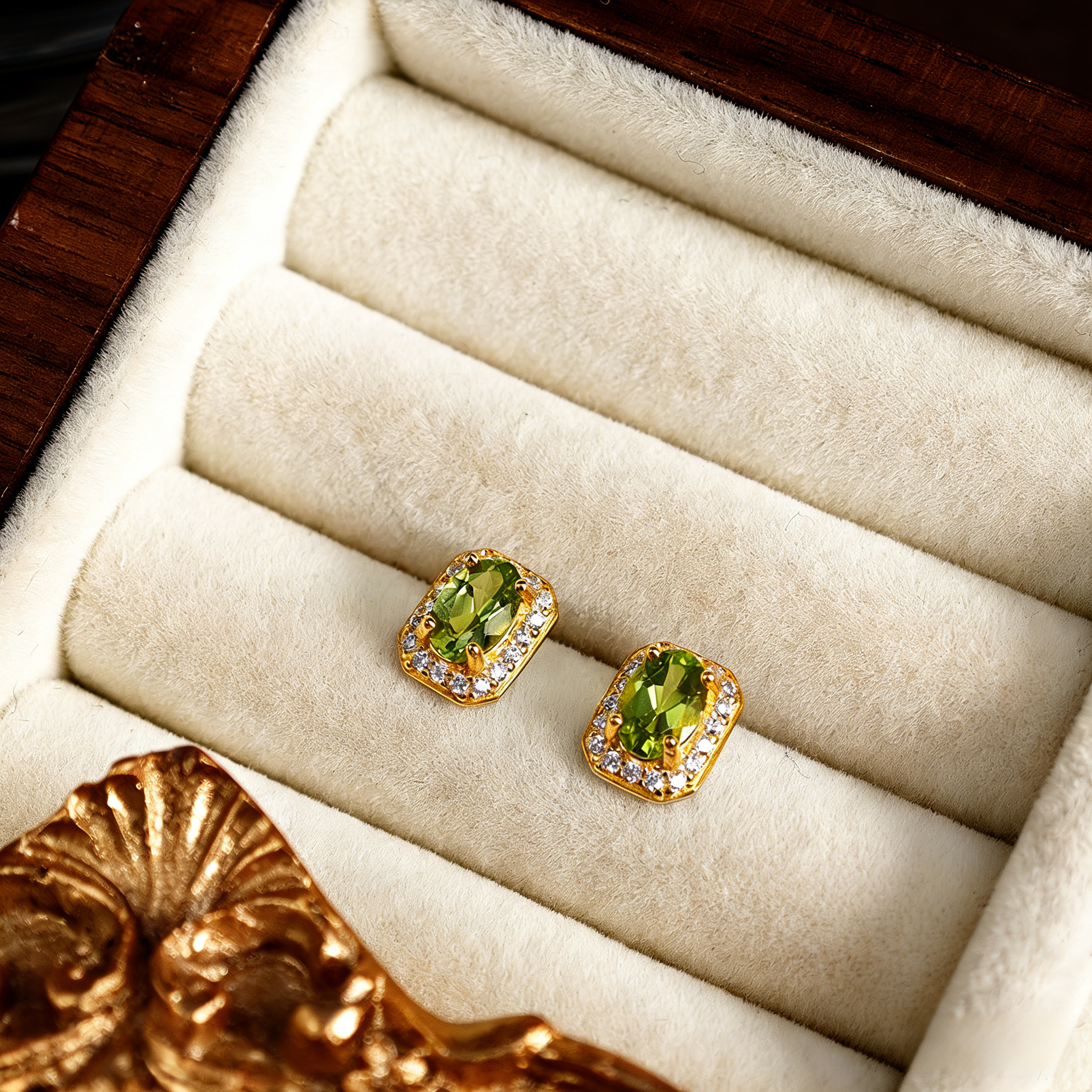 This pair of earrings draws inspiration from the Victorian-era vintage jewelry design, which was renowned for its intricate craftsmanship and elegant, understated luxury. Peridot, known as the “Sun Stone” in Western culture, was revered by ancient Egyptians as a sacred gem that could capture the sun’s light and bring brightness, peace, and good fortune to the wearer. The square halo setting of the earrings echoes the geometric design aesthetics of the Art Deco period, symbolizing stability and elegance, while the natural peridot’s vibrant green hue represents new life and hope, aligning with Western spiritual beliefs in pursuing positive energy and inner peace.