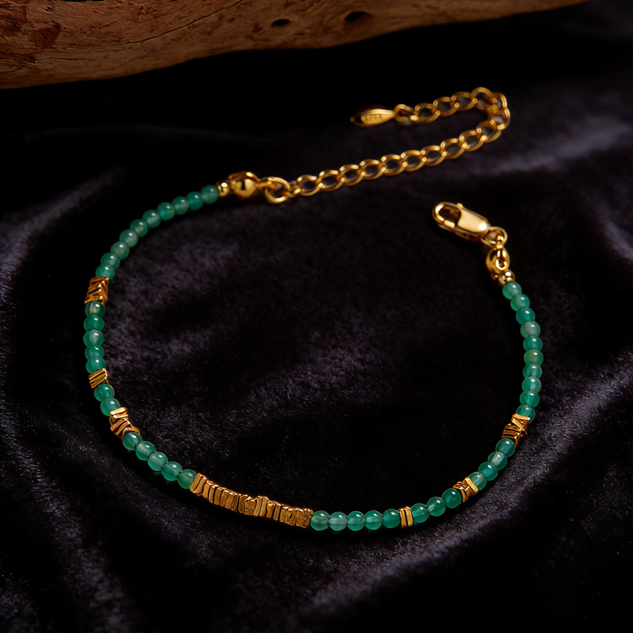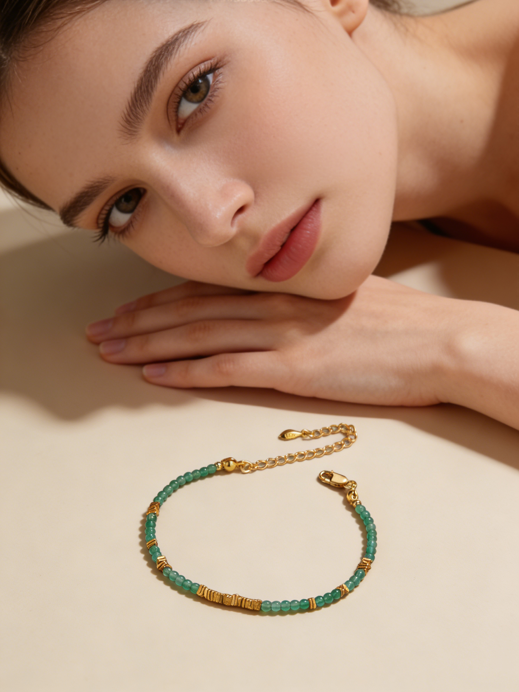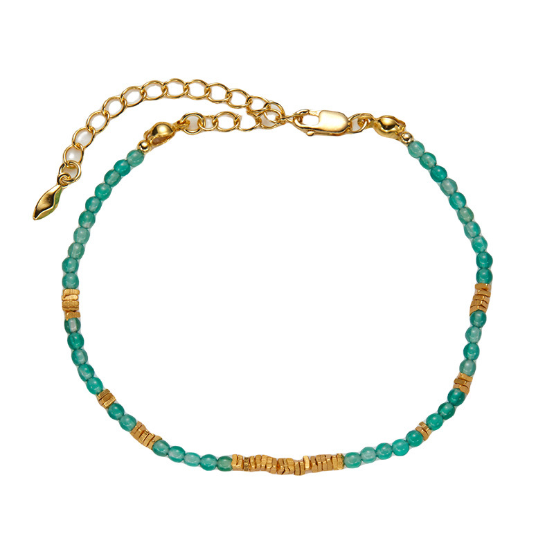 This ultra-delicate beaded bracelet features tiny, polished natural green chalcedony beads, paired with hand-textured vintage-style gold-plated 925 sterling silver spacer beads. The hypoallergenic 925 sterling silver base ensures comfortable, long-lasting wear, making it ideal for those with sensitive skin. It comes with an adjustable extension chain, allowing you to customize the fit to your own preference perfectly. The slim, lightweight design catches the light softly, adding a subtle, elegant touch to your wrist without being overwhelming, highlighting the natural, fresh green hue of the chalcedony that brings a breath of natural vitality to your everyday look.
