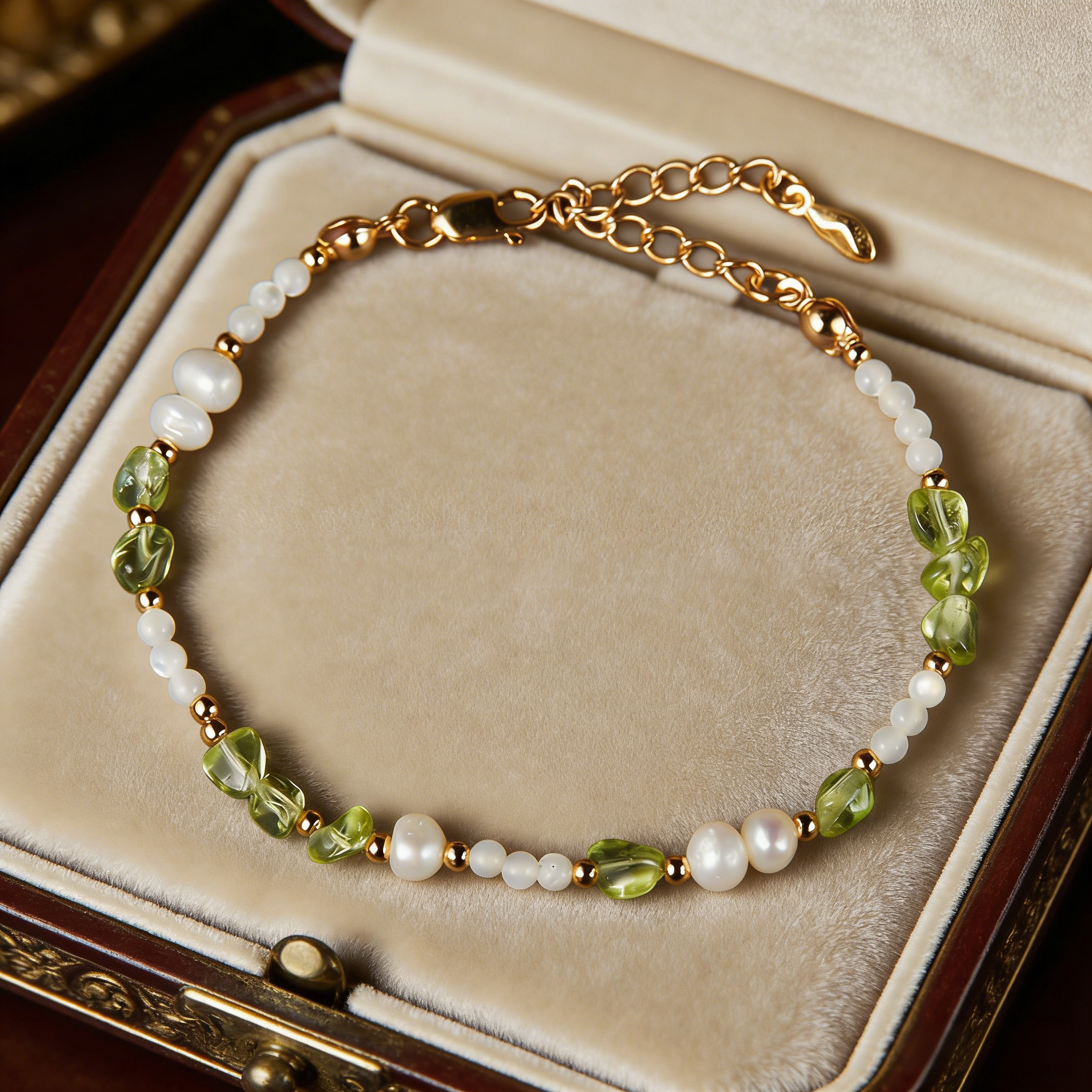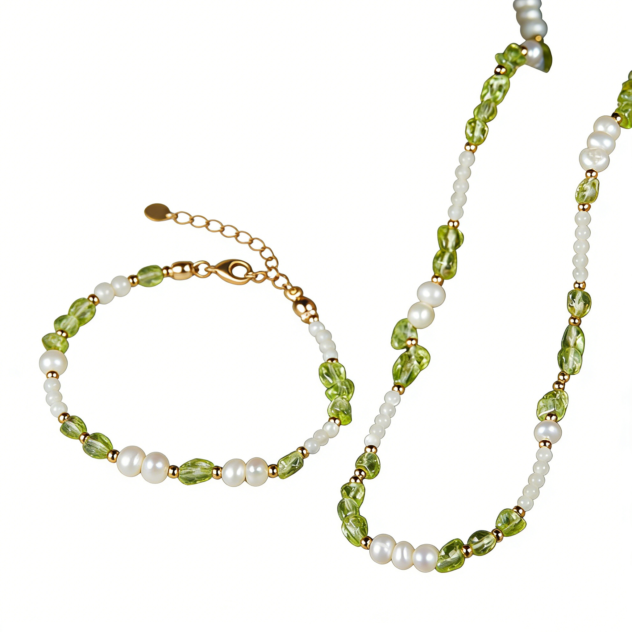This collection includes two separate pieces: a dainty beaded necklace and a matching adjustable bracelet. Each piece features irregular natural peridot gemstones with that fresh, grassy green hue, paired with lustrous freshwater pearls and tiny smooth mother-of-pearl beads. The gold-plated spacers add a touch of sophisticated shine, creating a sweet yet luxurious look. The irregular cut of peridot retains the raw beauty of nature, while the mix of different-sized beads creates a dynamic, eye-catching rhythm that flatters any neckline and wrist. All stones are 100% natural, with unique inclusions that make your piece one-of-a-kind. Please note that the necklace and bracelet are separate pieces, not a fixed set. You can choose to purchase the necklace or bracelet individually, or pair them together for a complete look.