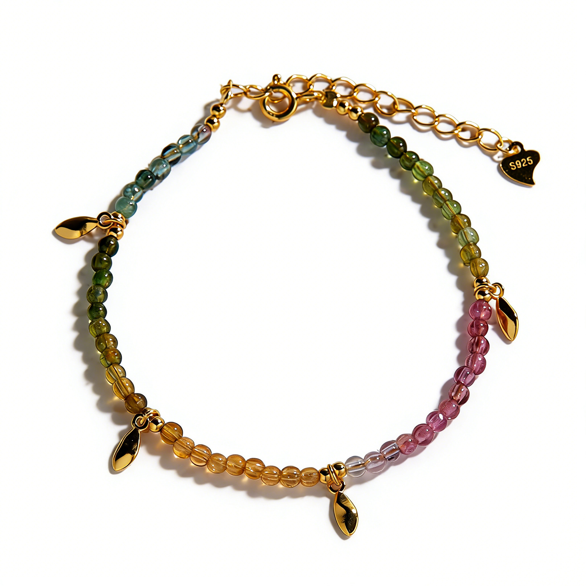A natural tourmaline necklace and a natural tourmaline bracelet. The main stone is natural tourmaline with gradient colors from pink to green to blue, each tourmaline bead retains the natural texture and unique luster. The accessory part is made of 925 silver, with delicate leaf-shaped pendants, and the chain part is designed with a combination of beaded and metal chain, which adds a sense of hierarchy to the overall design. Both the necklace and the bracelet have adjustable chain lengths, which can be adjusted according to different wearing needs.