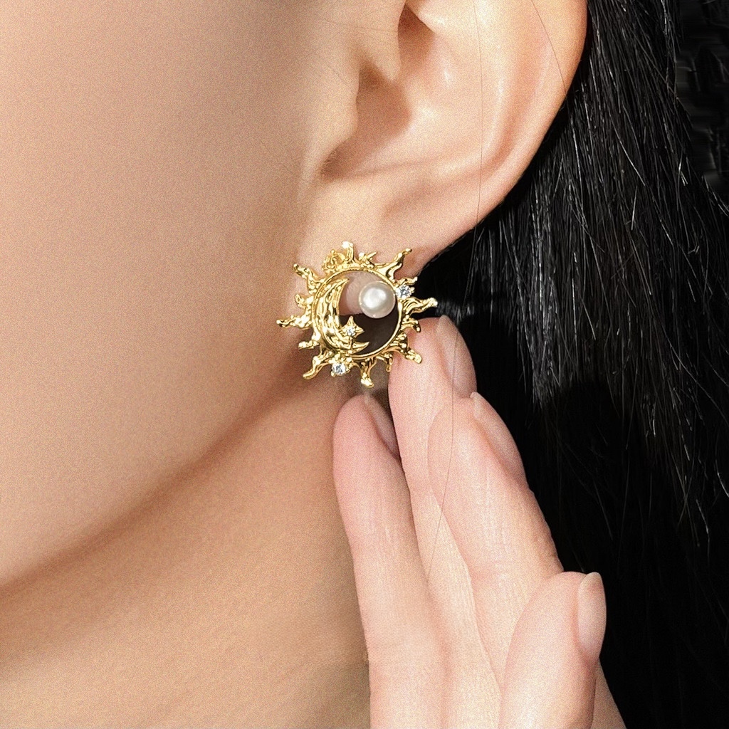 Sun and Moon Original thick plated 18K real gold freshwater pearl zircon earrings retro literary and artistic light luxury 925 silver needle earrings