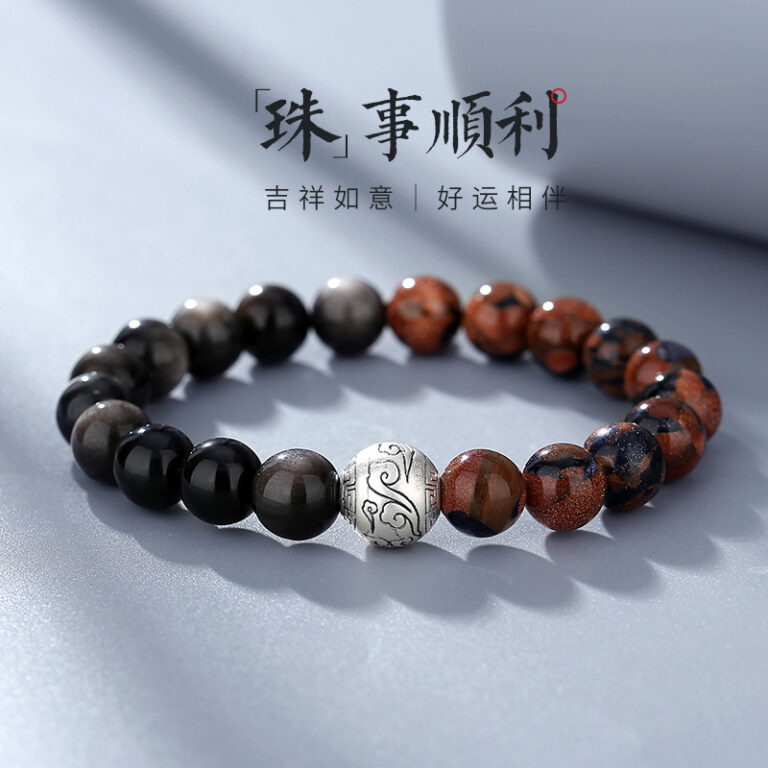 Retro Natural Obsidian Bracelet for Men, Pure Silver 999